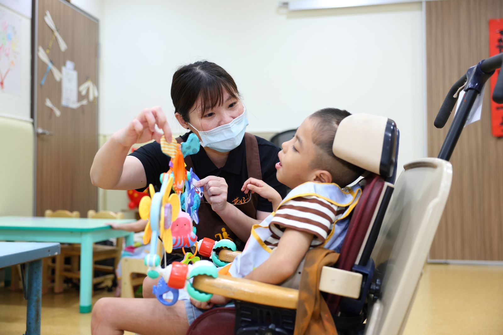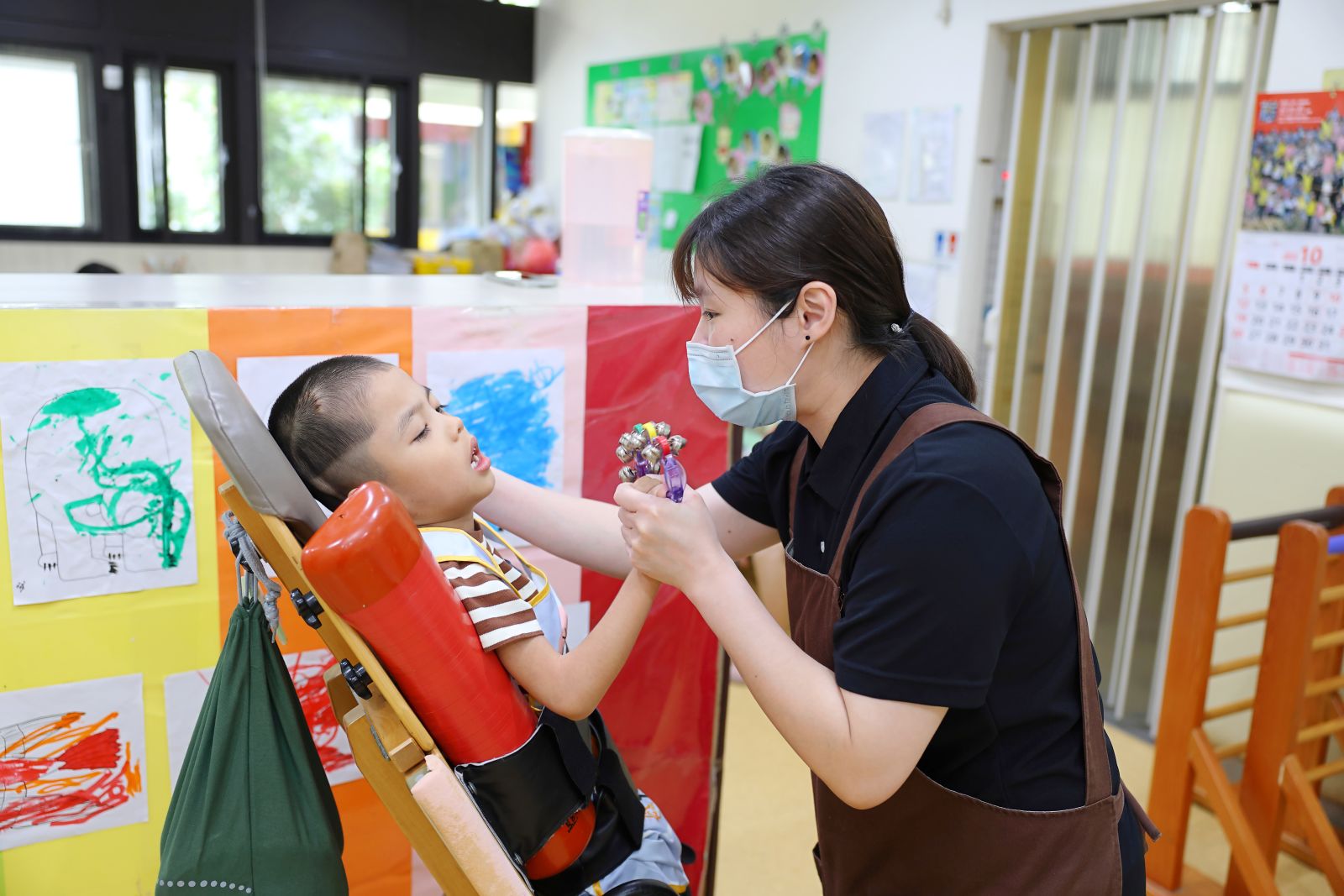 在伊甸早療日托中心的專業陪伴下,透過職能、語言治療師與教保員的協助,阿弘癱軟的肌肉逐漸被喚醒,認知能力一步步提升,如今他能開口叫出「阿嬤」,這聲得來不易的呼喊,是多年努力的成果。