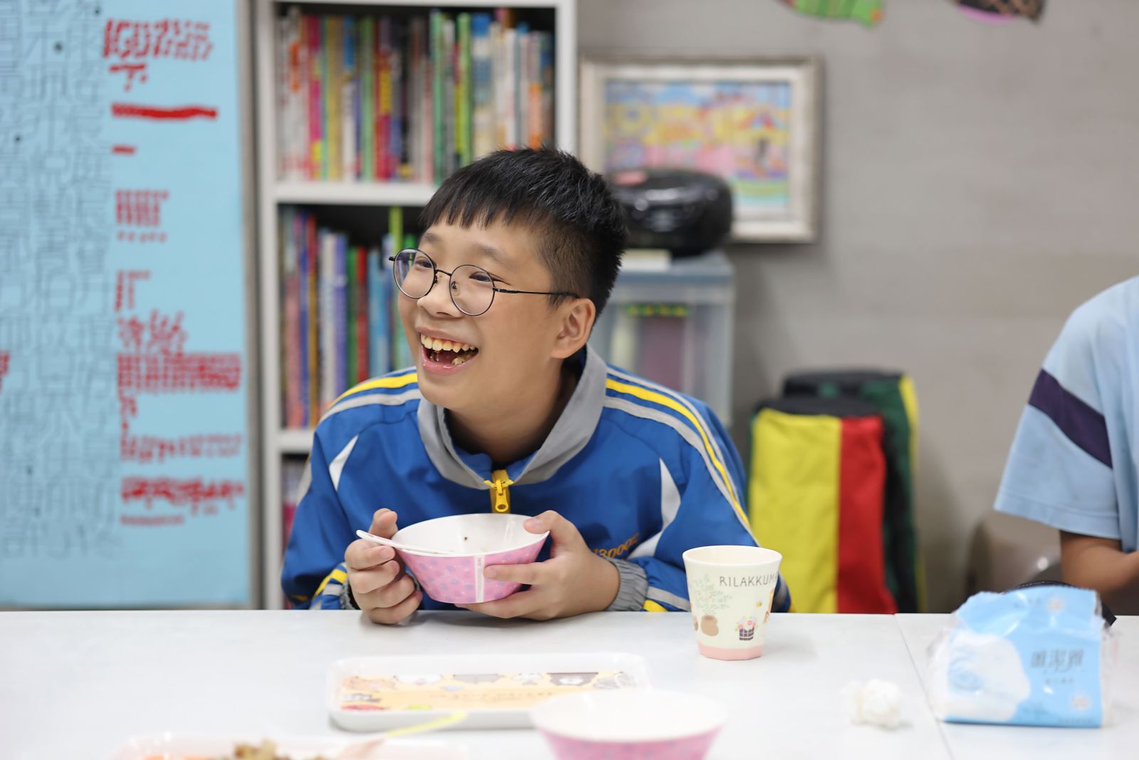 起初,小安只是靜靜坐在餐廳裡,看著同學和學長姐一邊用餐、一邊聊天的熱鬧景象。漸漸地,小安他開始願意主動走進餐廳,也會將盤子裡的早餐吃得乾乾淨淨。老師和廚工阿姨的耐心嘗試與陪伴,慢慢融化了他最初的猶豫,也重新建立了他對生活的安全感與信任。
